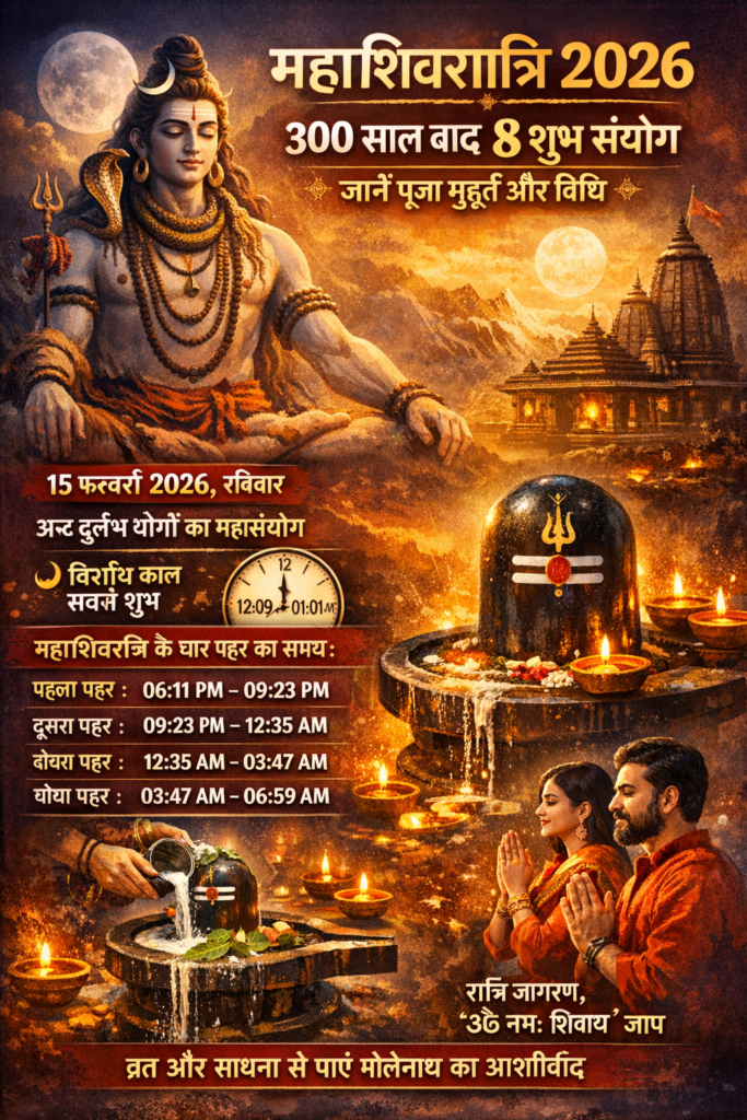 महाशिवरात्रि 2026: 300 साल बाद 8 शुभ संयोग — जानें पूजा-पाठ, चार पहर के शुभ मुहूर्त और विधि 🕉️🙏
